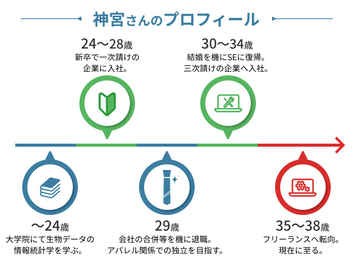 SE歴12年、現在はPMOとして自動車会社のプロジェクトに携わる神宮さん。正社員時代は、三次請けによる低賃金や、自分の意志で配属先や仕事内容を選べないことに悩んでおり、家族を持つ身として、将来的にはもっとキャリアアップをしたいと考えていました。