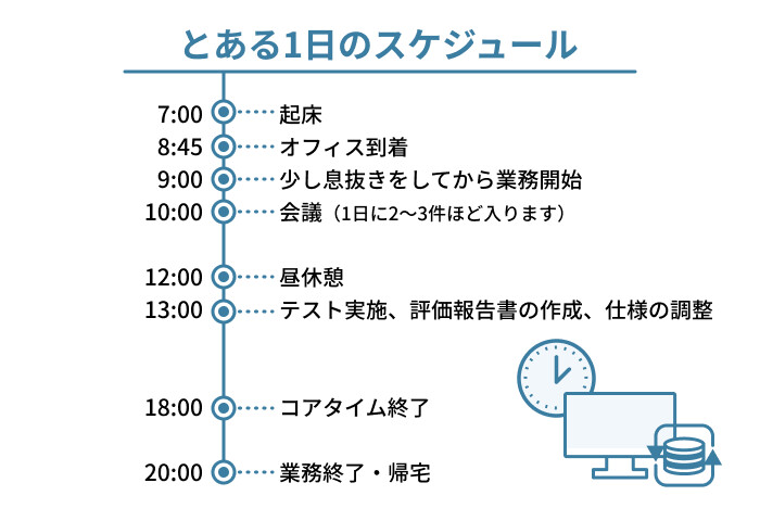 一日の流れとしては、平均して2~3個の会議が入っています。それ以外の時間は、テストの実施や、テスト仕様書の作成・まとめ作業に充てていることが多いですね。