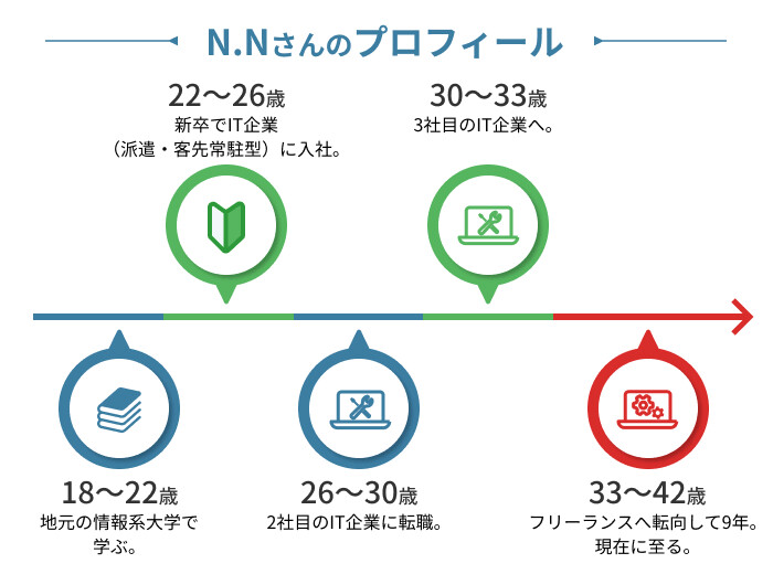 2023年1月からレバテックフリーランスを活用されているN.Nさん。 知人の一言をきっかけに会社員13年目でフリーランスへ転身し、現在はフルリモートで上流工程を担っています。