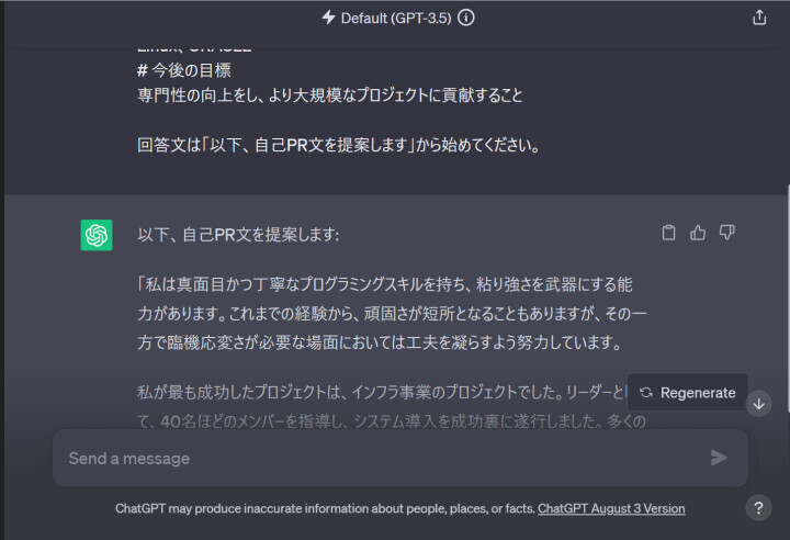 ただし、きちんと項目を記入し、テンプレート通りに入力しても、一度では期待通りの自己PR文が得られない可能性もあります。そのような場合は、「Regenerate」ボタンから何度か再生成を試してみましょう。また、特にアピールしたいポイントやこだわりがある場合は、プロンプトの指示を修正し、納得できる自己PR文を完成できるまで、入力を試してみるとよいでしょう。