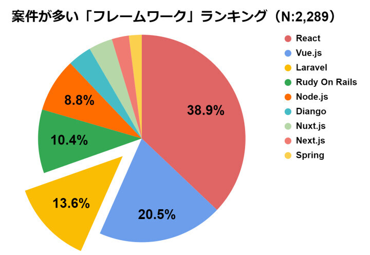 CAMELORS株式会社が行った調査では、案件が多いフレームワークランキング(プログラミング言語)の第三位がLaravelという結果になりました。